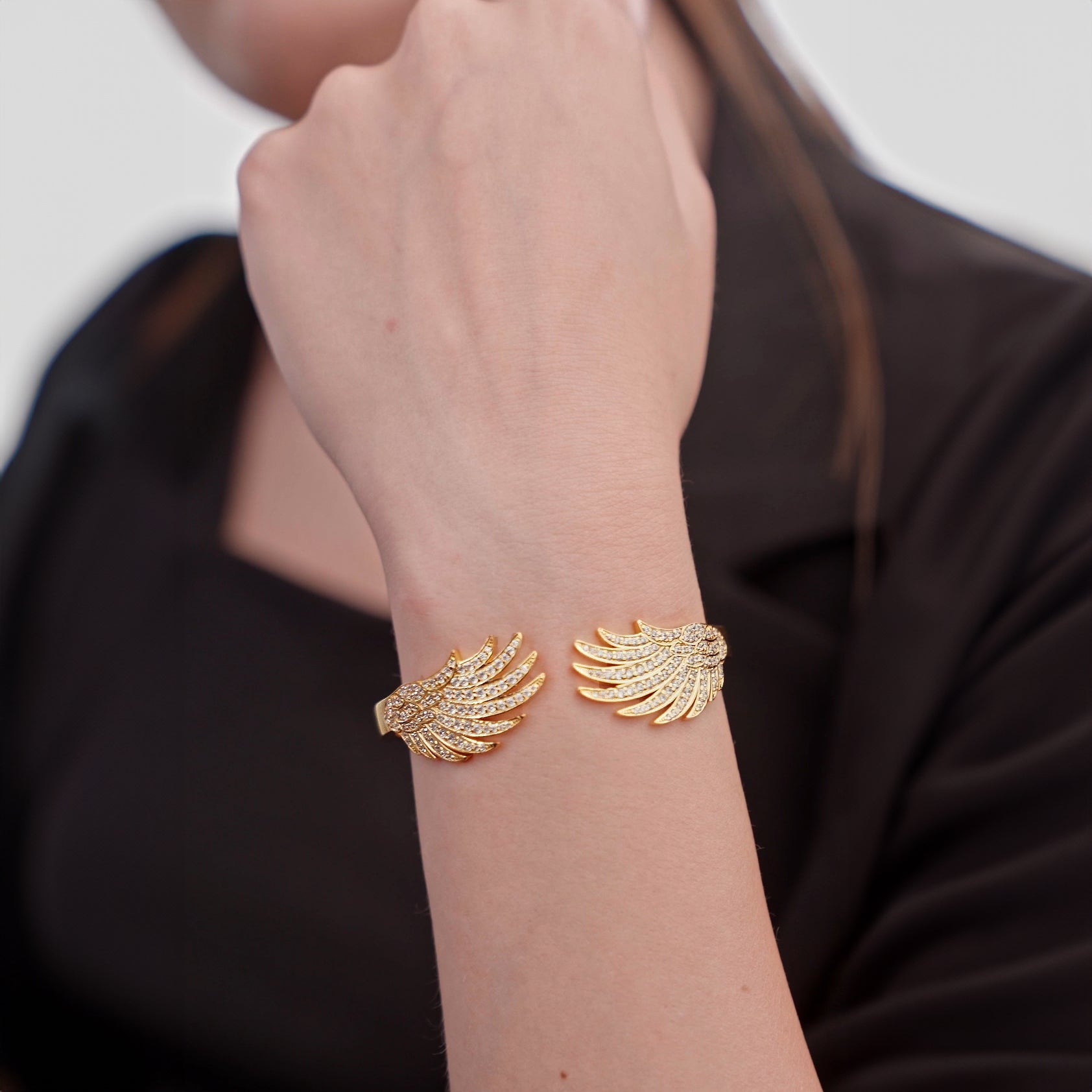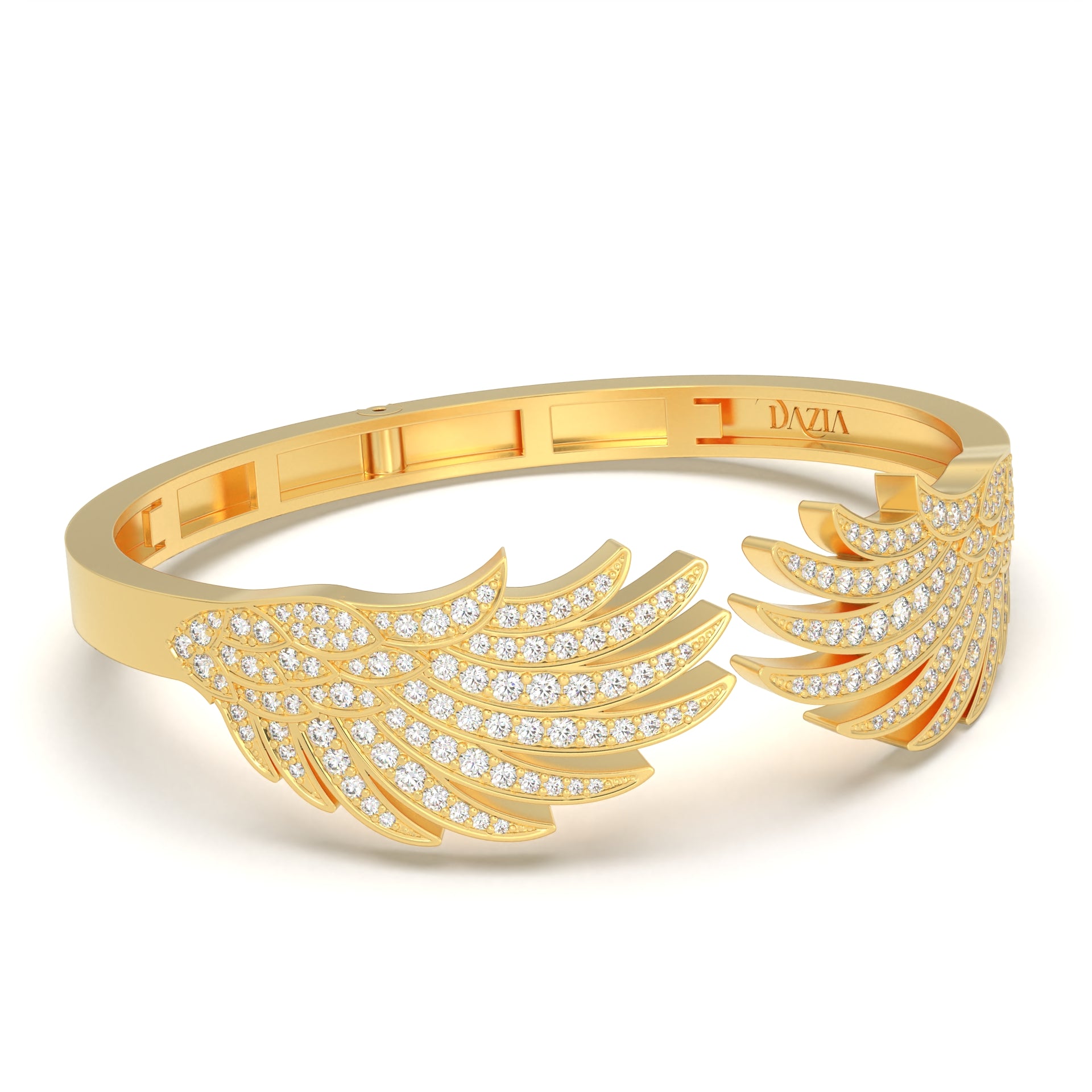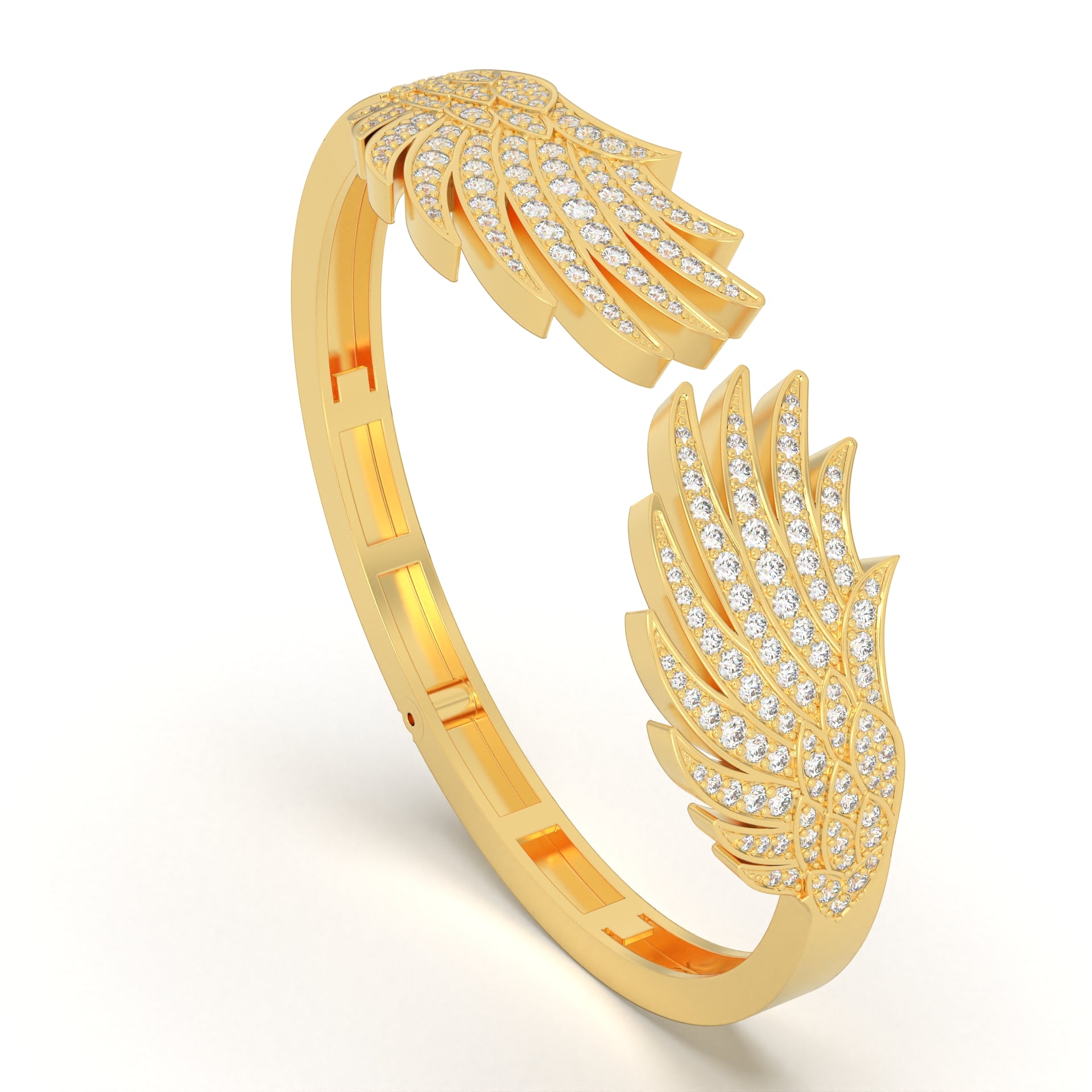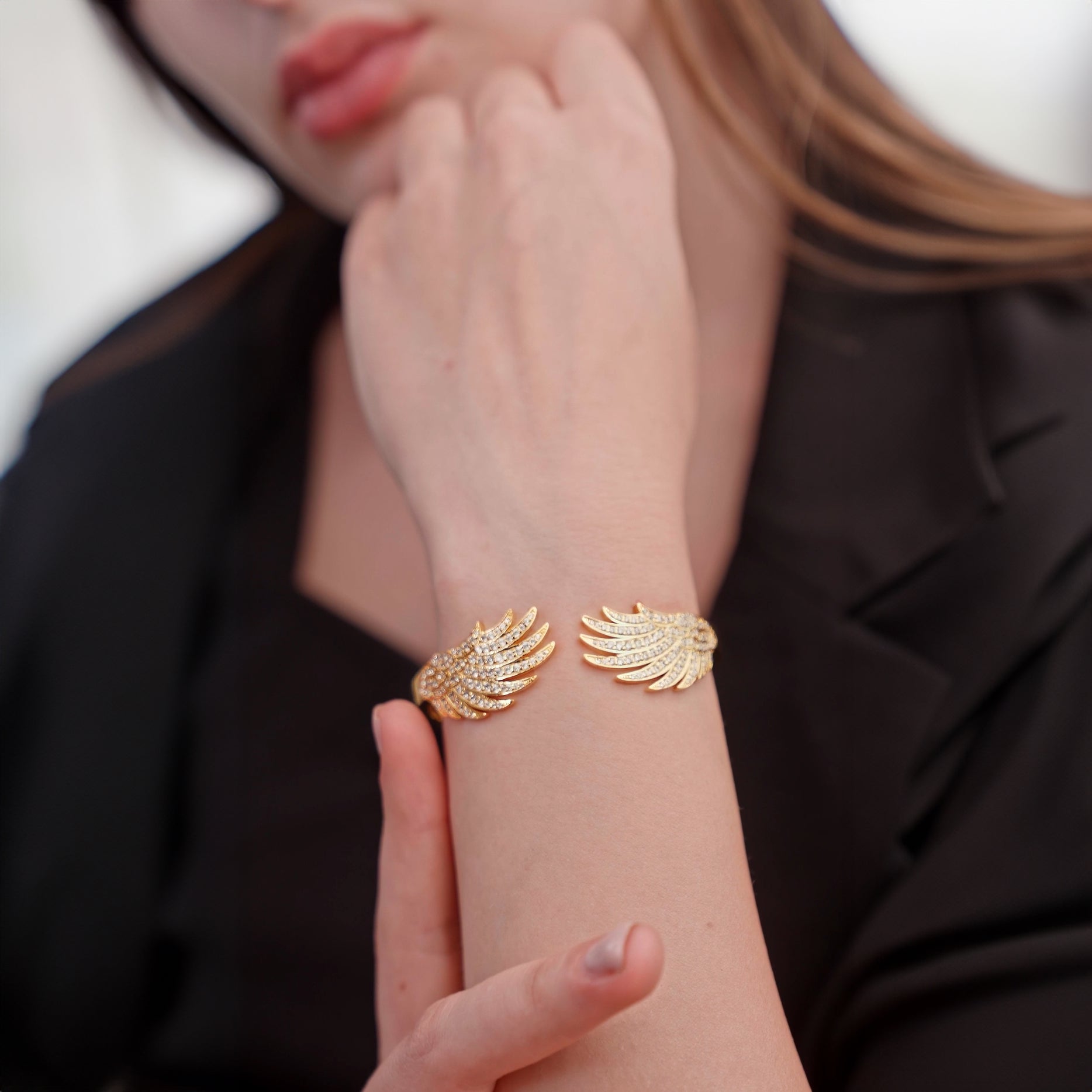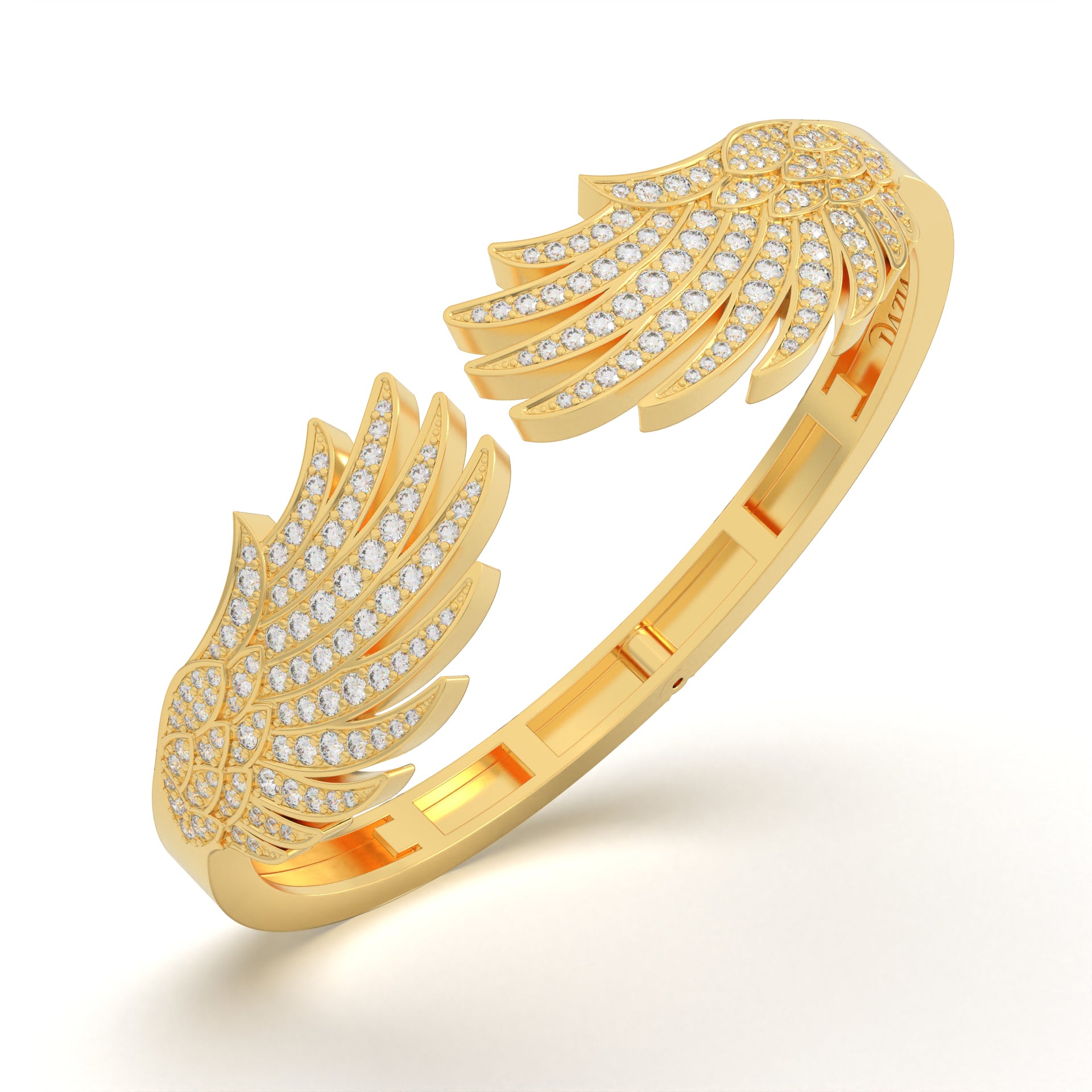 The 'Protective Embrace' bracelet is a masterwork of craftsmanship, with its delicate curves adorned with shimmering diamonds, symbolizing the protective and nurturing wings of the phoenix.