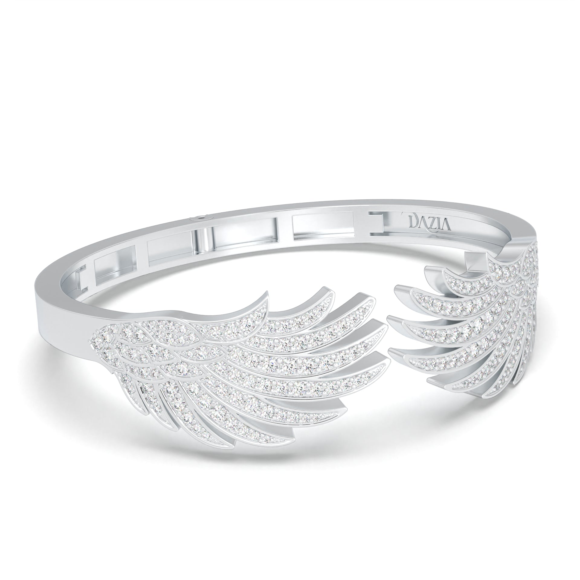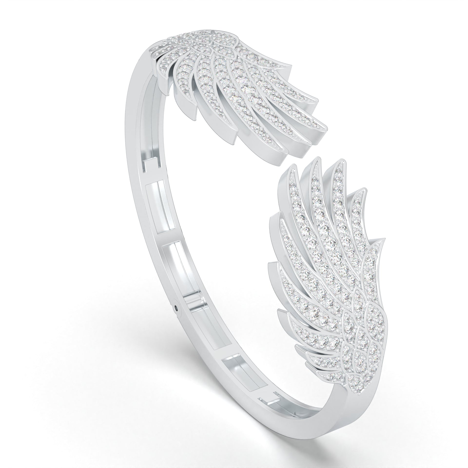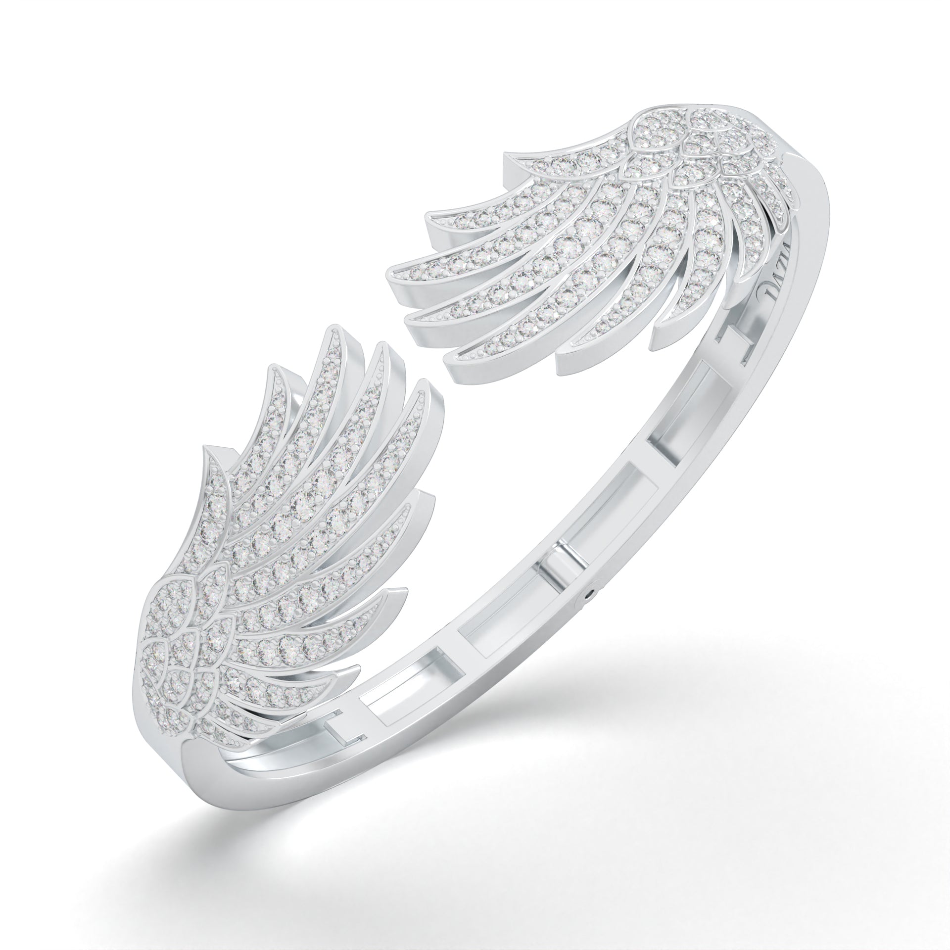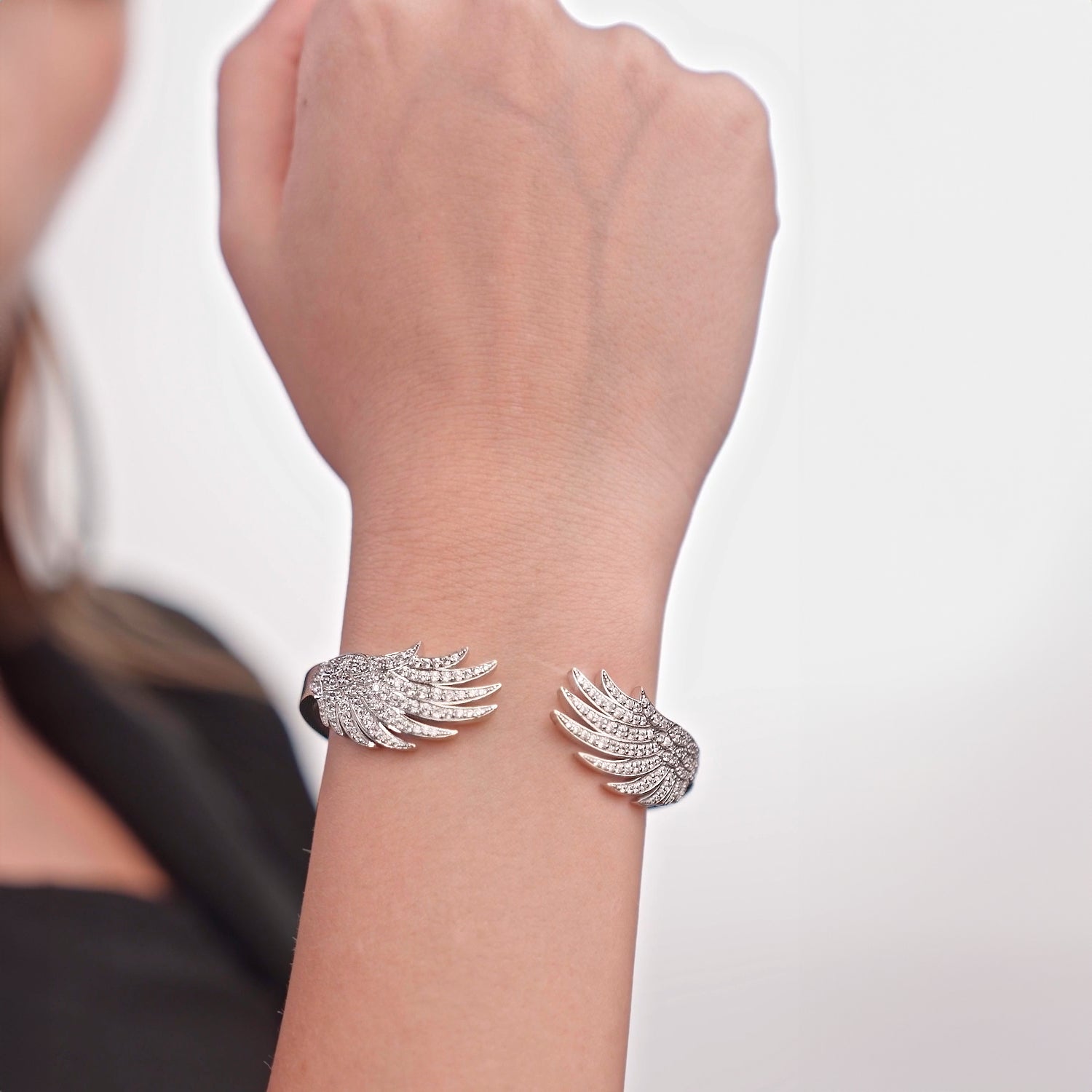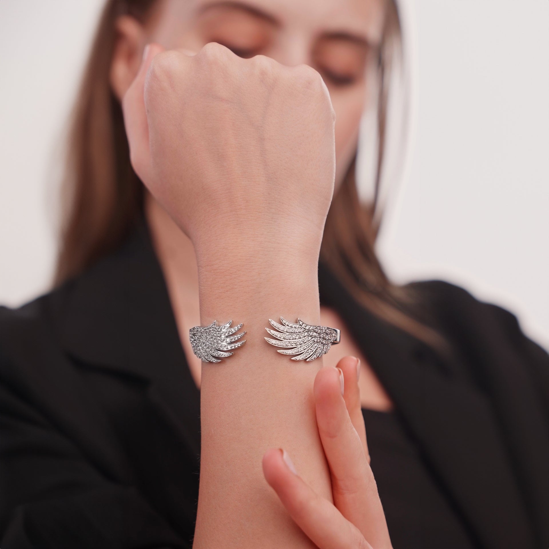 The 'Protective Embrace' bracelet is a masterwork of craftsmanship, with its delicate curves adorned with shimmering diamonds, symbolizing the protective and nurturing wings of the phoenix.