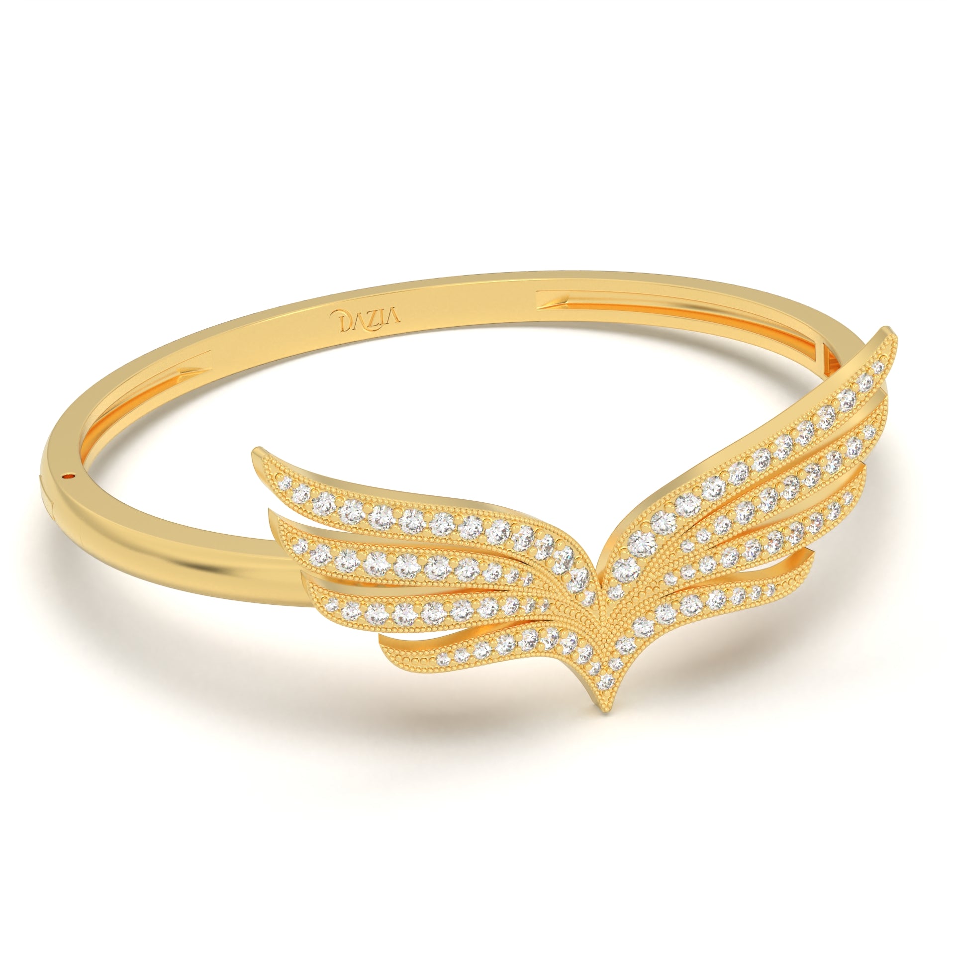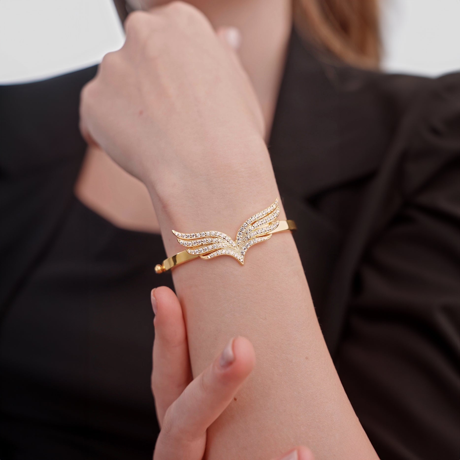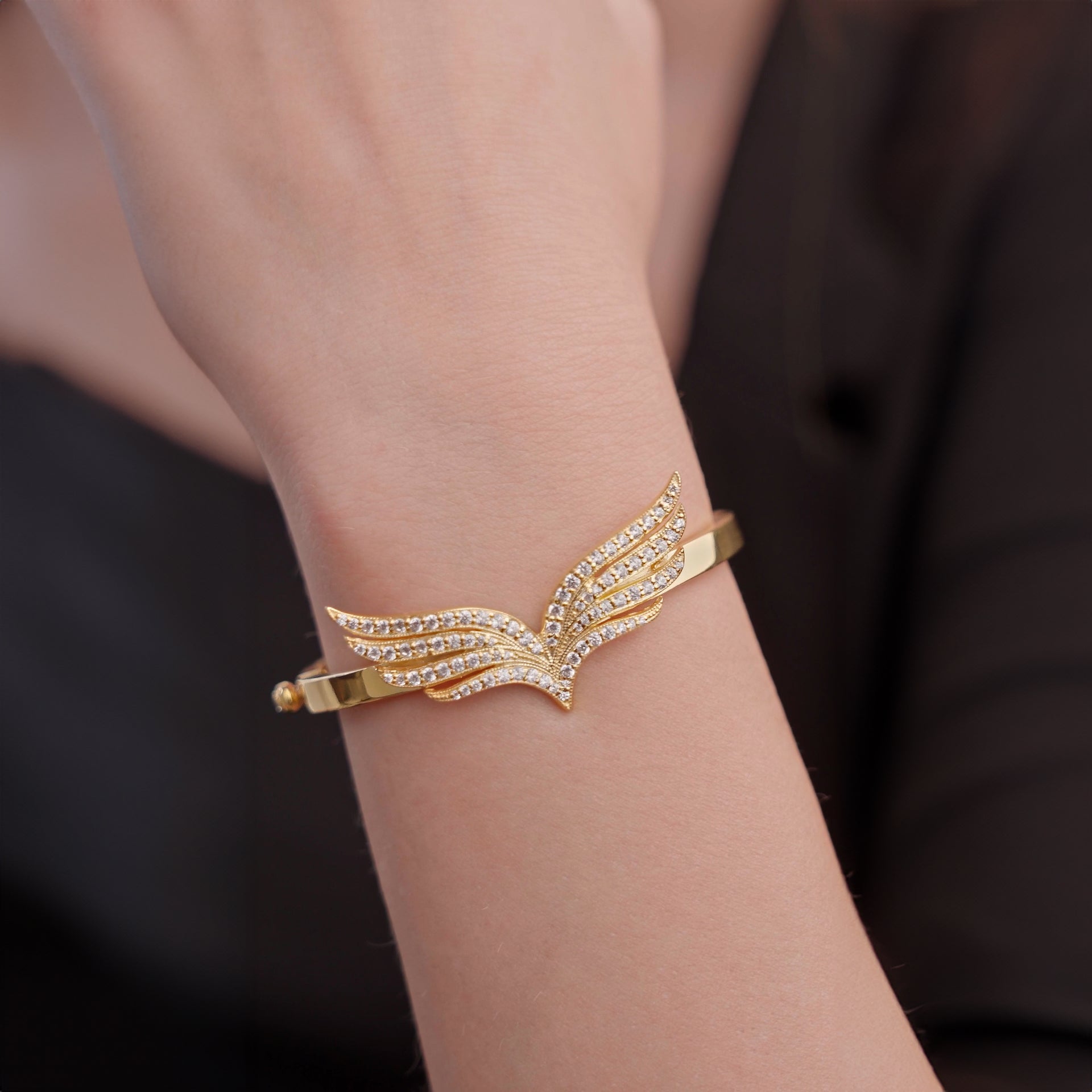 The 'Wings of Power' bracelet is designed for those who rise with determination, featuring bold lines and radiant diamonds that mimic the strong wings of the phoenix in full flight.