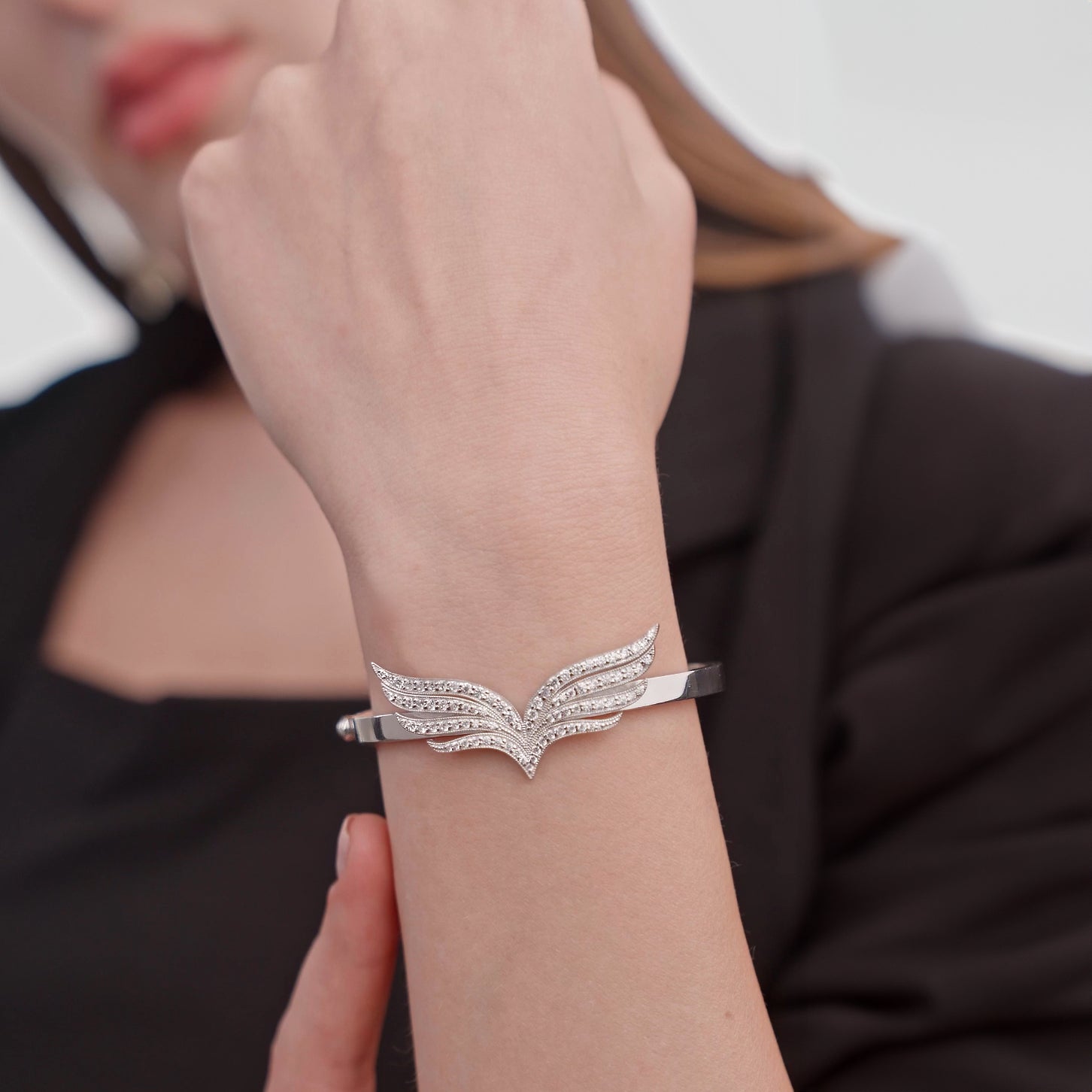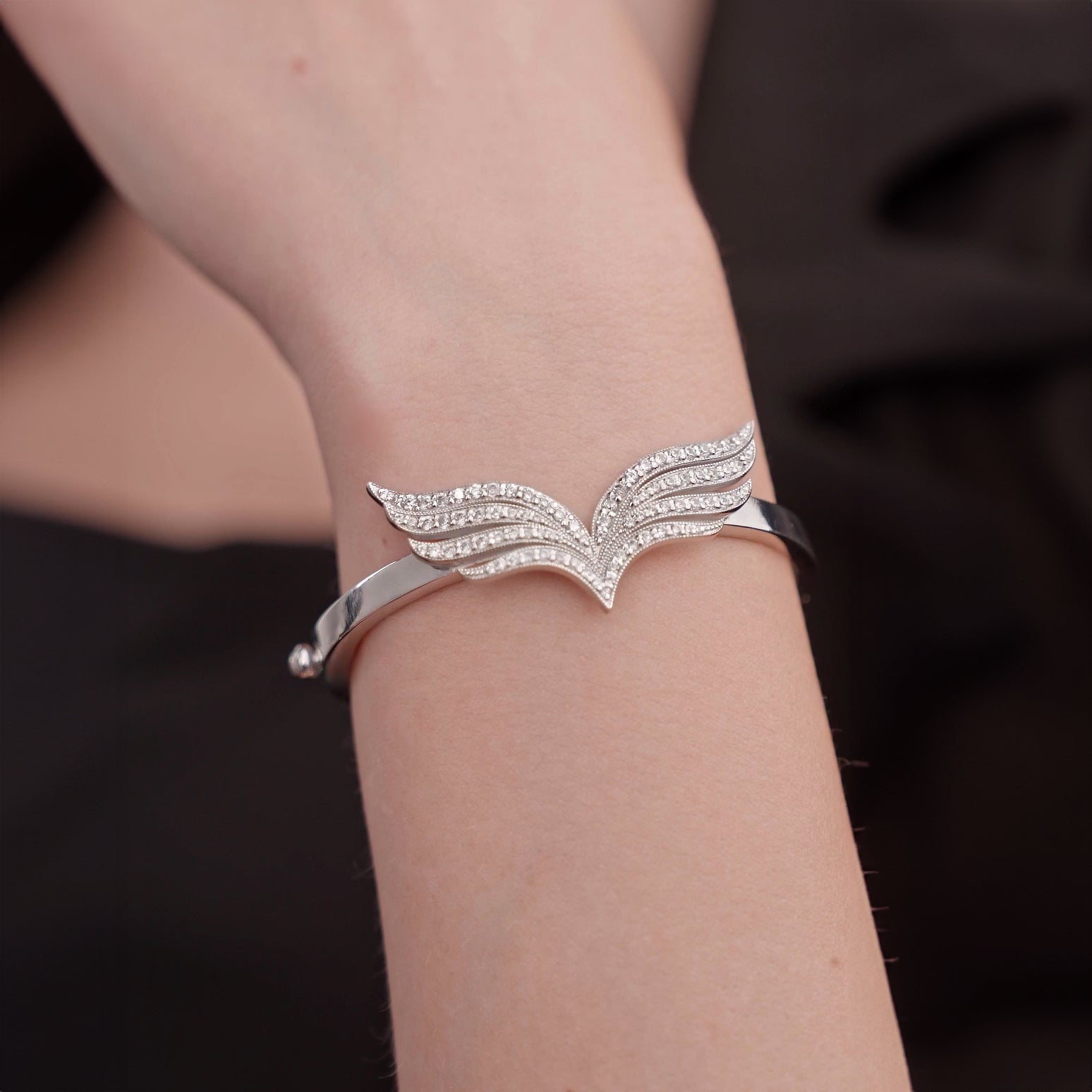 The 'Wings of Power' bracelet is designed for those who rise with determination, featuring bold lines and radiant diamonds that mimic the strong wings of the phoenix in full flight.